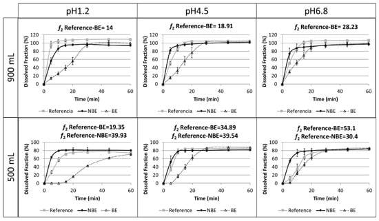 The reference and NBE products showed complete dissolution (>85%) in 15 min in the USP 2 at 50 rpm in 900 mL of buffered media at pH 1.2, 4.5, and 6.8. However, the BE product showed complete dissolution at 30 min. The same tests were conducted at 500 mL to verify whether a volume lower than 900 mL could detect differences in BCS class III formulations. However, the amount dissolved in these reduced volumes did not reach complete dissolution. Therefore, these dissolution tests are difficult to interpret.