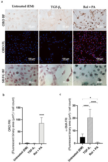 Effect of TGF-β1 and Rol + PA on LX-2 cells. (a) Representative microscopy images of lipid droplets (ORO staining) and collagen (Sirius Red/Fast Green staining). Lipid droplets in bright field (ORO BF) appear as brown spots and in fluorescence (ORO FL) as red spots (nuclei stained with blue DAPI). The presence of collagen (SR/FG BF) is observed in purple in bright field, while non-collagenous proteins are stained green. (b) Bar graph showing the ORO fluorescence normalized to the number of cells in the DAPI field (FRI). **** p ≤ 0.0001 vs. EM and TGF-β1. Mean ± S.D. (n = 3–6). (c) Bar graph showing the α-SMA fluorescence normalized to the number of cells in the DAPI field (FRI). * p ≤ 0.05, **** p ≤ 0.0001. Mean ± S.D. (n = 3).