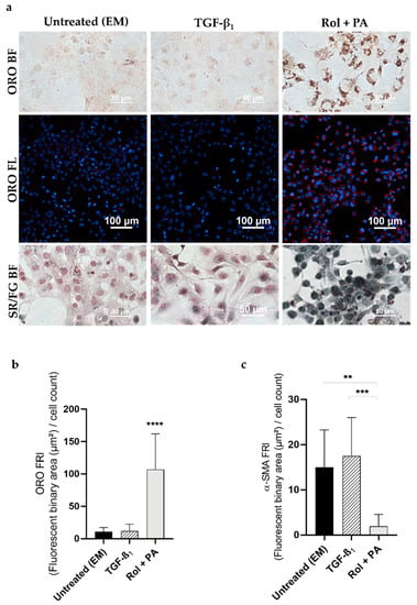 Effect of TGF-β1 and Rol + PA on pLX-2 cells. (a) Representative microscopy images of lipid droplet staining (ORO in bright field and fluorescence; ORO BF; ORO FL) and collagen staining (Sirius Red/Fast Green in bright field; SR/FG BF). (b) Bar graph showing the ORO fluorescence normalized to the number of cells in the DAPI field (FRI). Mean ± S.D. (n = 3–6). **** p ≤ 0.0001 vs. EM and TGF-β1. (c) Bar graph showing the α-SMA fluorescence normalized to the number of cells in the DAPI field (FRI). Mean ± S.D. (n = 3). ** p ≤ 0.01, *** p ≤ 0.001.