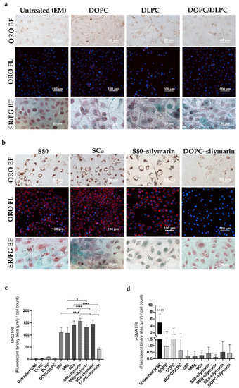 After LX-2 cell perpetuation, cells treated with S80–silymarin exhibited non-collagenous proteins (Figure 4b). All the other lipids stained equally for collagenous and non-collagenous proteins (Figure 4a,b and Figure S8). α-SMA expression in perpetuated LX-2 cells treated with PPC-containing liposomes decreased slightly in comparison with TGF-β1-treated cells (Figure 4d), thus reflecting a steady partial activated HSC state, as recently suggested in a study elucidating the fate of HSC/myofibroblasts in experimental fibrosis [58].