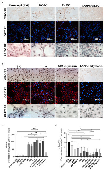 LX-2 cells directly treated with lipid-based formulations. (a,b) Representative images of ORO in bright field and fluorescence (ORO BF; ORO FL) and Sirius Red/Fast Green staining in bright field (SR/FG BF). (c) Bar graph showing the ORO fluorescence normalized to the number of cells in the DAPI field (FRI). Mean ± S.D. (n = 3–6). * p ≤ 0.05, **** p ≤ 0.0001. EM, DOPC, and DLPC/DOPC **** p ≤ 0.0001 vs. S80, SMg, SCa, S80–silymarin, SMg–silymarin, SCa–silymarin, and DOPC–silymarin. DLPC **** p ≤ 0.0001 vs. S80, SMg, SCa, S80–silymarin, SMg–silymarin, SCa–silymarin, and *** p ≤ 0.001 vs. DOPC–silymarin (not shown). (d) Bar graph showing the α-SMA fluorescence normalized to the number of cells in the DAPI field (FRI). Mean ± S.D. (n = 3). **** p ≤ 0.0001 vs. DLPC, DOPC, DOPC/DLPC, S80, SMg, SCa, S80–silymarin, SMg–silymarin, SCa–silymarin, and DOPC–silymarin.