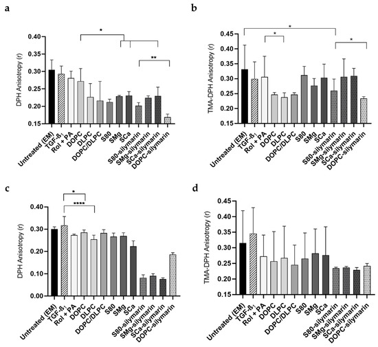 In direct treatments, a decrease of DPH anisotropy correspondent to increased motional order of the inner cell membrane was observed following Rol + PA treatment when compared to the EM, in accordance with previous reports [60]. As far as phospholipid treatments were concerned, all the liposomal formulations significantly increased the motional order with respect to that observed with EM and TGF-β1, except for DOPC (Figure 5a). Specifically, DOPC treatments did not affect the DPH anisotropy, while a significant treatment-induced decrease (p ≤ 0.0001) of the measured anisotropy coefficients (r) could be observed with DLPC, S80, SMg, SCa, and silymarin liposomes (r value > 0.22) compared to EM (r value of 0.30). The ability of DLPC to be incorporated into damaged sections of the cell membrane and to increase membrane fluidity has long been proposed to be the reason behind the hepatoprotectant action of EPLs, but has never been experimentally investigated [36]. DOPC–silymarin treatment decreased r significantly from a value of 0.30 (untreated LX-2 cells, EM) to a value of 0.17.