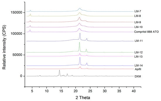 The solute state of DXM in the solidified lipid composition was analyzed with XRD. The lipid mixtures (LMs) containing solid and liquid lipids in a 9:1 and 7:3 ratio (Table 1) were prepared on the basis of Section 2.2.1, and the melts were cooled to room temperature and investigated after 24 h.