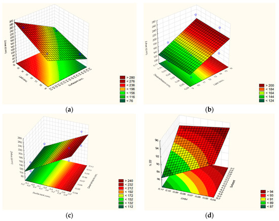 Zave is also affected by lipid (directly proportional), DXM, and surfactant concentration (inversely proportional) (Figure 2a–c), but the amount of surfactant showed the most remarkable impact. The combined effect of factors is less expressed as it was observed in the case of EE%, too. The increase of the surfactant amount can be beneficial for particle size reduction, but as we could conclude from Equation (4), it can deteriorate the drug loading capacity (lower EE% values).