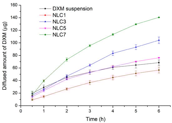 The mathematical modelling of the in vitro release data showed the DXM release from NLCs and suspension followed Higuchi release kinetics (R2 is higher than 0.99 for NLCs, and higher than 0.98 for suspension). This type of kinetics indicates a diffusion-controlled release from the systems (Table 8). It could be clearly seen the NLCs containing 0.10% DXM showed a remarkable drug release, at 6 h. The amounts of the released drug from NLC7, NLC3, and the DXM suspension were 140, 104, and 68 µg, respectively (Figure 3). These results can predict a 100% increase in drug release using NLC7. When we consider the NLCs containing 0.05% DXM, the NLC-1 composition displayed a lower amount of the released drug at each time point while the NLC5 composition was similar to the suspension form (no significant differences during the drug release, except at 6 h, where a significantly higher drug amount was detected in the case of NLC5). This finding can also confirm that the NLC composition can increase the amount of the released drug.