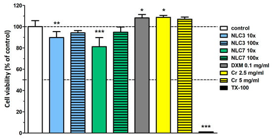 In order to analyze the possible toxicity of the formulated NLCs, a human cornea cell viability study was applied, where the most relevant compositions (NLC3 and 7) based on the drug release study, the emulsifier (Cremophor RH60), and DXM were investigated [4].