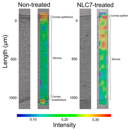 NLC7-treated porcine cornea specimen was compared with non-treated cornea specimen using Raman correlation mapping. The spectrum of NLC7, containing DXM as well, was used for the cornea distribution correlation maps. Figure 5 shows a high Raman intensity on the top of the cornea specimens in both cases (non-treated, treated), which can correspond to the high lipid content of the epithelial layer and the surface of the tear film. In contrast, the NLC7-treated cornea has a higher Raman intensity for the lipid components in the 200–400 µm depth of the cornea, the depth of which corresponds to the stroma layer. This observation means the nanocarriers entered and enriched in the hydrophilic part of the cornea, which is considered as a main limiting barrier for hydrophobic materials. Based on these results, the penetration of DXM through the cornea might be achieved by using nano lipid carriers.