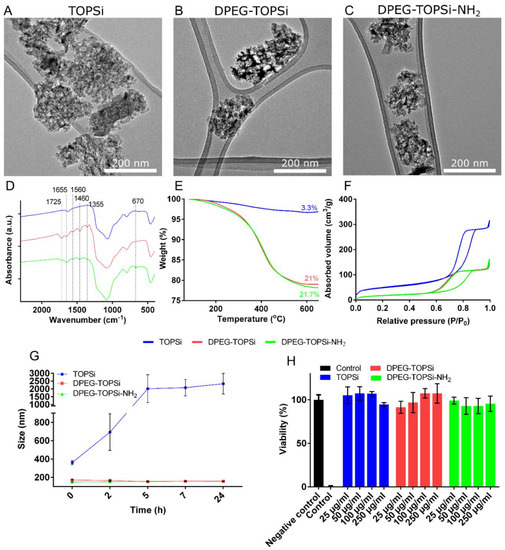 Characterization of the nanoparticles: (A–C) TEM images of TOPSi, DPEG-TOPSi, and DPEG-TOPSi-NH2 NPs, (D–F) FT-IR spectra, TGA, and N2 ad/desorption curves (TOPSi (Blue), DPEG-TOPSi (Red) and DPEG-TOPSi-NH2 (Green)), (G) Colloidal stability of the nanoparticles in PBS at 37 °C at different time points, and (H) Viability of macrophages when incubated with different nanoparticles.