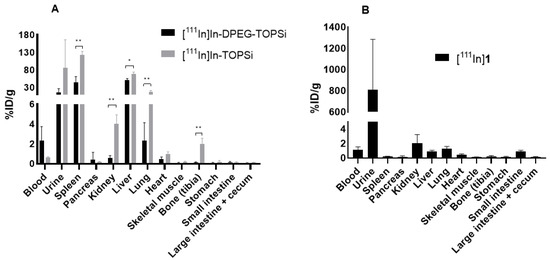 Biodistribution of (A) [111In]In-DPEG-TOPSi and [111In]In-TOPSi and (B) [111In]In-DOTA-PEG4-Tz ([111In]1) at 1h in Balb/c mice (n = 4). Statistical analysis was made by using a t-test analysis, significant differences were found in liver, kidney, lung, spleen, and bone (thibia).