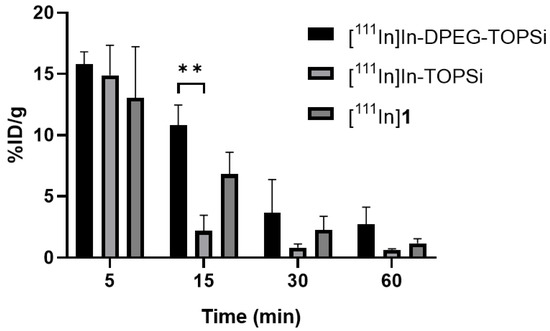 Quantification of resident time in blood for [111In]In-DPEG-TOPSi, [111In]In-TOPSi and [111In]1 in Balb/c mice (n = 4) at 5 min, 15 min 30 min and 1 h after intravenous administration. Unpaired t-test was used to assess the statistical significance of the difference in the of the two particle types in blood, ** p > 0.0021.
