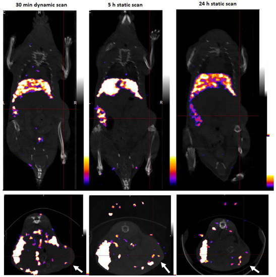 [111In]In-DPEG-TOPSi particles (100 µg, 2–4 MBq) were administered intravenously via the tail vein and the animals were imaged under isoflurane anesthesia at 30 min, 5 h, and 24 h after the NP administration (Figure 5.). Major uptake was seen already after 30 min in the spleen and liver, demonstrating the characteristic accumulation of non-targeted PSi NPs by the mononuclear phagocyte system (MPS). Unfortunately, the tumor activities were too low to be clearly visualized from the SPECT/CT images.