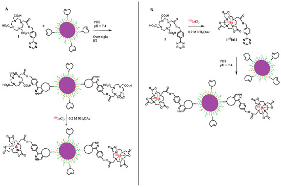 111In-radiolabeling of DPEG-TOPSi particles with approaches A and B.