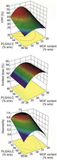 Surface plots depicting the effect of MOF content and the PLGA/LC ratio in %FPF and %ED. The desirability surface plot is also reported, indicating the conditions simultaneously satisfying the requirements of high %FPF and %ED, which grant the desired aerodynamic behavior. Color map: red = high values, blue = low values.