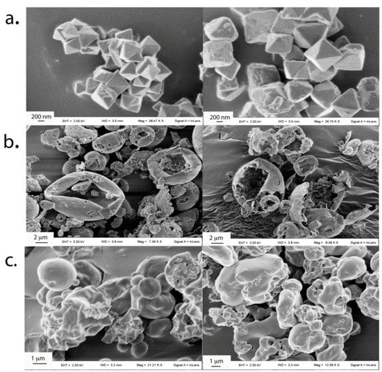 (a) SEM images of INH-MOF, (b) INH-MOF-loaded LC MPs, (c) INH-MOF-loaded PLGA MPs.