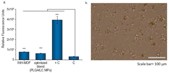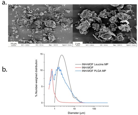 The encapsulation of MOF crystals produced fragile MPs, particularly LC MPs, that were partially fragmented during blending (Figure 3a). This resulted in broad particle size distributions with average volume-weighted diameters around 11 μm for MOF and 20 µm for PLGA MPs, while number-weighed diameters were from 0.9 µm for MOF to 4.2 µm for PLGA MPs and 6.7 µm for LC MPs (Figure 3b). Such size features suggest a compliance with pulmonary delivery requirements. In fact, it is suggested that the small particle size below 5 µm may grant better inhalation efficacy than larger particle size aerosols, owing to an enhanced penetration and retention in the lungs even in the presence of airway narrowing [41,42]. In particle size distribution of INH-MOF PLGA MPs (Figure 3b) two populations were observed: one corresponding to the particles and another to the free INH-MOF, which indicates the presence of MOF also on the surface of the INH-MOF PLGA MPs.