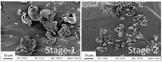 SEM images of the dispersed optimized INH-MOF-loaded optimized PLGA/LC MP blend—Powders deposited in the stage 1 and stage 2 of a twin stage impinger (TSI). The 2nd stage of TSI corresponds to the lower lung part in which the drug is intended to act.