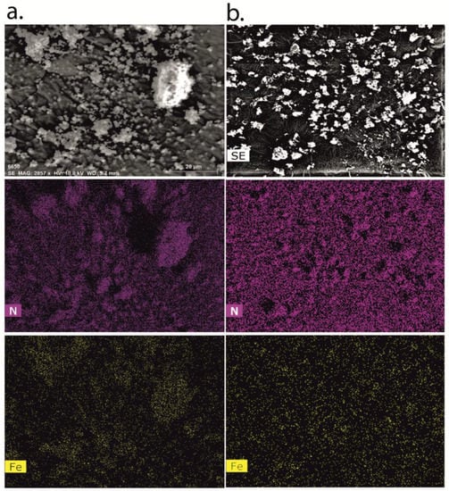 (a) EDX analysis of INH-MOF; (b) optimized INH-MOF-loaded PLGA/LC MP blend. Mapping shows nitrogen (purple) and iron (yellow) distributions.