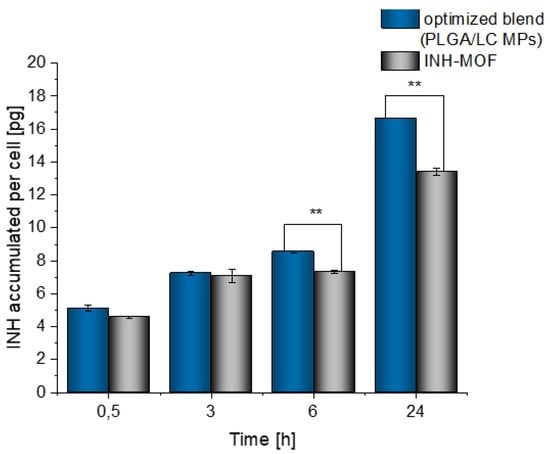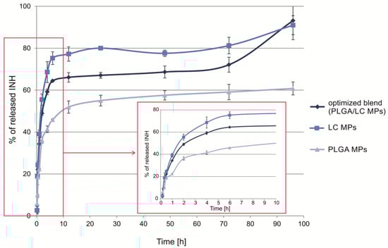 The drug was released faster during the initial 10 h than in the subsequent time period (Figure 6). As a result of the excipient properties, a higher INH release was observed for LC MPs compared to PLGA MPs (80% versus 59%, after 24 h). Since LC is water-soluble, a relatively fast LC MP dissolution was expected with simultaneous drug release. Therefore, the release from LC MPs depended on the intrinsic affinity of INH to MOF and MOF matrix degradation [28]. In fact, although LC MPs dissolve immediately, INH dissolution was controlled by MOF, especially at neutral pH, which determined the slow INH release. On the other hand, the hydrophobic nature of PLGA moderately reduced the initial phase of drug dissolution. Drug release from PLGA MPs was assumed to be the result of more complex hydration and diffusion processes. The hydrophobic properties of PLGA may explain the incomplete release of INH from PLGA MPs [43].