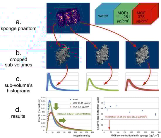 Concerning sponge phantoms, each sponge volume was extracted by 3D cropping, and for the cropped volume images the histograms were calculated. The histograms were normalized to the number of voxels in the image volume. The maximum value of each histogram was assessed. The maximum histogram values obtained for MOF wetted samples were expressed as relative to the maximum histogram value obtained for water wetted volume. The results for all measured MOF concentrations were fitted (linear fit) using Microsoft Excel 2010 (Microsoft, Redmond, WA, USA).