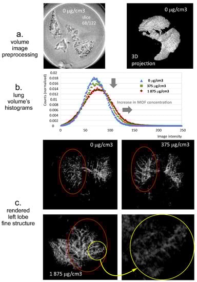 3D binary mask of the lung volume was obtained as a result of image segmentation of the original 3D image volume. The supervised image segmentation was performed using a Trainable Weka Segmentation 3D (TWS 3D) plug-in module (https://imagej.net/Trainable_Weka_Segmentation), part of the public domain software, Fiji distribution (https://fiji.sc/) of ImageJ—built on Waikato Environment for Knowledge Analysis (WEKA) data mining and machine learning toolkit [39]. The binary mask and the original image were multiplied (voxel by voxel multiplication). For the segmented volume images, the histograms were calculated and normalized to the total number of counts. Finally, rendered fine structure of the lungs was visualized using 3D Viewer plugin.