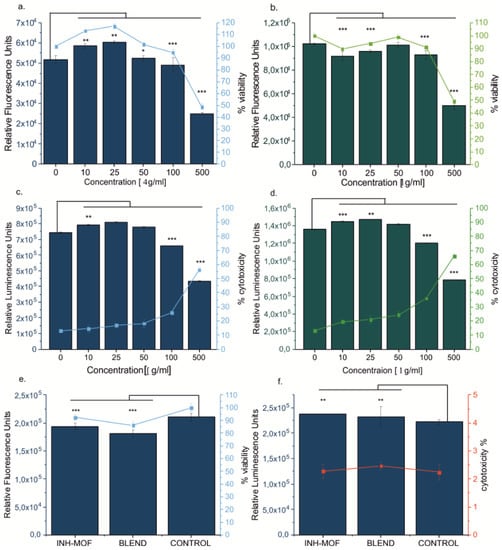 For the in vitro tests on cells, the bar-graph data show the means and standard deviations of one representative of 6 independent measurements. Significant effects (p < 0.05) were determined using the independent t-test, also called the two sample t-test, an inferential statistical test that determines whether there is a statistically significant difference between the means in two unrelated groups. The t-test was used to check differences between the samples cultured in the presence of MOF at different concentrations and control but not to compare different MOF concentrations with each other.