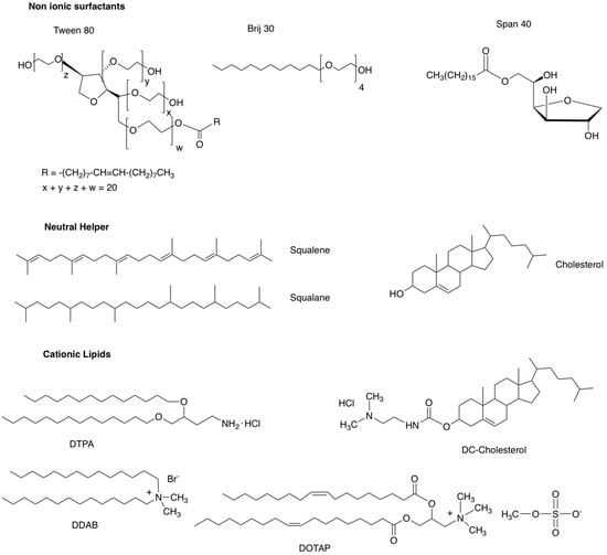 Cationic niosomes for nucleic acid delivery are made up of several elements including: (1) a non-ionic surfactant such as polyoxyethylene fatty acid esters or polysorbates (Tween® [26]), polyoxyethylene alkyl ethers (Brij® [27]), sorbitan fatty acid esters (Span® [28]); (2) a neutral helper lipid such as cholesterol or squalene (SQ) or squalene (SQL) [29,30]; and (3) a cationic lipid such 3β-[N-(dimethylaminoethane)-carbamoyl]-cholesterol hydrochloride salt (DC-Chol, [31]), N-[1-(2,3-Dioleoyloxy)propyl]-N,N,N-trimethylammonium methylsulfate salt (DOTAP, [32]), dimethyldidodecylammonium bromide (DDAB, [33]) or 2,3-di(tetradecyloxy)propan-1-amine hydrochloride salt (DTPA, [34]) (Figure 1).