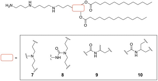 As part of a program focused on developing novel cationic lipids based on spermine analogues addressed to improve the delivery of DNA plasmid, the same authors were able to introduce the same fatty acid residue (C14) as described on Figure 2 but by varying the chemical structure of the spacer. Four more analogues were proposed (di(oxyethyl)amino (7), di(oxyethyl)aminocarboxy (8), 3-amino-1,2-dioxypropyl (9) and 2-amino-1,3-dioxypropyl (10)) [71] (Figure 3). These four spermine analogues were formulated into the same niosomes (Chol and Span-20) as described above. The authors carried out exhaustive physical characterization of the particle size by varying the amount of cationic lipid. As a consequence, the corresponding DNA particles had sizes that ranged from 94 to 195 nm, remarkably smaller than those shown above [14,15]. Before evaluating the efficiency of these cationic formulations with DNA plasmid (pEGFP-C2), exhaustive cytotoxicity and serum stability studies were also carried out. The authors found it had minimal effect on cellular viability and significant stabilities of the particles for up to 6 h. In vitro transfection experiments were carried out using the selected cationic lipids with a molar ratio of 0.5. This resulted in an optimized spermine-based formulation containing Span20:Chol:8 (2.5:2.5:0.5) which shown promising ability to impart cellular uptake in HeLa cells.