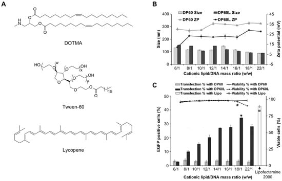 Particle characterization and in vitro gene transfection experiments mediated by niosomes made up DOTMA, Tween-60 and Lycopene. (A) Chemical structures; (B) particle size and zeta potential of nioplexes; (C) cellular viabilities and gene transfection after 72-h incubation in ARPE-19 cells. Control positive was carried out with lipofectamine. Adapted with permission from ref. [78]. Copyright 2017, Elsevier B.V.