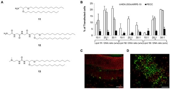 In light of these findings, Ojeda et al. carried out SAR studies by designing novel synthetic amino lipids (11–13) containing three different cationic polar heads such as an amino (11), triglycine peptide (12) and dimethylamino ethyl (13) pendent groups (Figure 5A) [82]. These three cationic lipids were formulated into the corresponding cationic niosomes in which SQ was part. After confirming that all of them were able to form nioplexes when mixed with a DNA plasmid (pCMS-EGFP), several physicochemical studies were carried out. It is worth mentioning that nioplex formation differed from the process used, thus the oil-in-water (O/W) emulsion technique led to lower polydispersity (PDI) values when compared to the film-hydration method. Interestingly, the prepared nioplexes displayed different a stability behaviour at different temperatures. Thus, while particle size and ζ-potential remained constant at 4 °C for 100 days, these parameters changed remarkably after incubating the nioplexes at 25 °C showing particle stabilities after less than one month. In vitro transfection experiments mediated by these novel nioplexes confirmed that the ionizable cationic lipid 11 and 13 promoted better efficiencies than formulations based on the tripeptide in ARPE-19 and PECC cells at the optimized 30:1 mass ratio (Figure 5B). These promising results were also demonstrated in vivo experiments by introducing both intravitreal (Figure 5C) and subretinal (Figure 5D) injections showing EGFP expression in photoreceptors and in the outer nuclear layer as well as in cerebral cortex administration in rat brains.