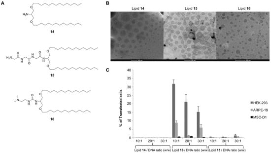 Glycerol-based cationic lipids have proved to be efficient vehicles for transporting DNA plasmids, in particular lipids 11 and 13. The impact of the amino lipids’ backbone on gene transfection was also studied in depth (Figure 6). Ojeda et al. proposed the use of serinol-based amino lipids (14--16) as novel vehicles to impart cellular uptake [46]. This study was aimed at synthesizing a small series of amino lipid derivatives containing the same cationic head pendent groups and hydrophobic residues as illustrated on Figure 5 but varying the backbone structure (Figure 6A). The oil-in-water emulsion technique gave rise to the corresponding cationic niosome formulations with nanometric size and lower PDI values when compared to the film-hydration approach (Figure 6B). Surprisingly, the authors found significant differences depending on the cationic lipid polar group after promoting cellular internalization. Thus, serinol-based amino lipids containing the ionizable dimethylamino ethyl residue (16) was able to transfect efficiently HEK-293 and ARPE-19 cells providing greater internalization results at 10:1 and 30:1 as an optimal mass ratio, (respectively) without affecting cellular proliferation (Figure 6C).