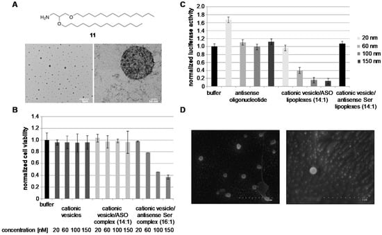 In addition to displaying excellent efficiencies for the delivery of DNA plasmid, our research group decided to use synthetic amino lipid 11 to prepare cationic niosomes made up of non-ionic surfactant Tween-80 in order to prepare the corresponding nioplexes with a model antisense oligonucleotide (Figure 7) [92]. Interestingly, the expected nioplexes displayed spherical morphologies with nanometric sizes (324 and 332 nm at optimized N/P ratios of 14 and 16, respectively) (Figure 7A). Toxicity studies confirmed that N/P ratios greater than 16 had a strong negative effect on cellular proliferation (Figure 7B). To avoid this, gene transfection experiments were carried out in vitro at N/P ratios of 14 confirming the ability of cationic lipid 11 to silence luciferase efficiently [93] with comparable efficiencies to commercially available cationic lipids (approximately 85% of inhibition at 100 nM) (Figure 7C).