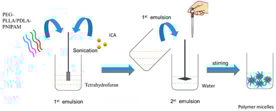 PEG-PLLA/PDLA-PNIPAM polymer carrier (10 mg) and 1 mg icariin were accurately weighed, and dissolved in 1 mL tetrahydrofuran by ultrasonic dissolution. The solution was slowly added, dropwise to 10 mL of distilled water while stirring at room temperature. Tetrahydrofuran was then removed by volatilization. The drug-loaded mixed polymer micelles were prepared. The reaction process is shown in Figure 2.