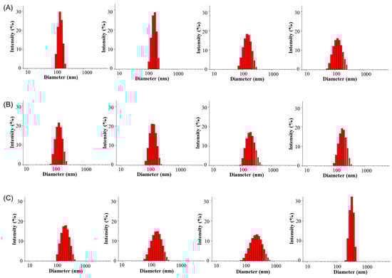 Particle size distribution of PEG-PLLA/PDLA-PNIPAM polymer micelles in PBS solutions of pH 1.2, 6.8, and 7.2, respectively, in 48 h (from left to right are 0 h, 6 h, 12 h, and 48 h, respectively).