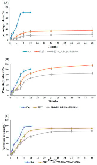 In vitro release profiles of ICA, ICA–F127, and ICA–PEG-PLLA/PDLA-PNIPAM in pH 1.2 (A), 6.8 (B), and 7.4 (C) buffer solutions, respectively (n = 3).