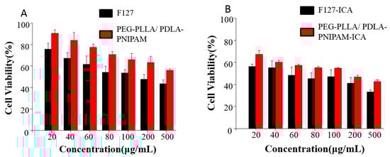 The cytotoxicity of PEG, F127, ICA–F127, and ICA–PEG-PLLA/PDLA-PNIPAM micelles were investigated at indicated concentrations. The results are shown in Figure 6. The results showed that the toxicity of blank micelles was less than that of drug carrier micelles, and that the toxicity of PEG-PLLA/PDLA-PNIPAM micelles was less than that of F127 under the same conditions regardless of drug carrier.