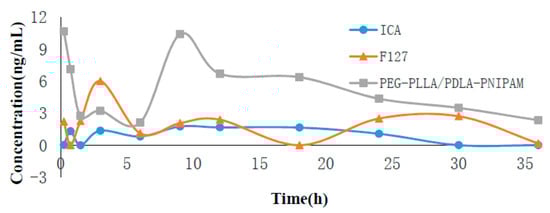 The pharmacokinetics of ICA-loaded polymeric micelles were performed using quantitative analysis of its blood concentration. The peak area of blood samples was measured using a triple quadrupole mass spectrometer, and the concentration was calculated according to the standard curve. The time–drug curve is presented in Figure 7. Plasma concentrations of ICA in the PEG-PLLA/PDLA-PNIPAM polymer micelle formulation decreased slowly, and were significantly higher than those of the other two groups. Drug parameters’ calculations were obtained using Das3.0 software. PEG-PLLA/PDLA-PNIPAM, as a polymer carrier, effectively increased the exposure of prototype drugs in vivo and prolonged the drugs’ therapeutic effects (Table 3). The relative bioavailability of PEG-PLLA/PDLA-PNIPAM was 216% of F127, and 500% of the ICA monomer. Additionally, the main metabolites’ analysis results (Supplementary Figure S1) showed that the amount of ICA metabolites encapsulated by PEG-PLLA/PDLA-PNIPAM polymer micelles was remarkably lower than that of the other two groups, and the ICA encapsulated by PEG-PLLA/PDLA-PNIPAM polymer micelles was more stable in vivo (metabolite concentrations were aligned using the ICA standard curve).