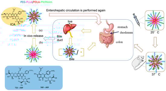 After oral administration, Icariin (ICA) is easily hydrolyzed by bacteria in the intestinal tract into baohuoside I and icaritin, thus significantly reducing ICA’s bioavailability. Nano-polymeric micelles can improve the permeability of drugs through membranes, and effectively avoid drug loading digestion by intestinal bacteria, which might serve as an important approach for improving drug bioavailability. In this experiment, PNIPAM in the synthesized PEG-PLLA/PDLA-PNIPAM polymer carrier was a temperature-sensitive polymer with LCST at 32 °C. Therefore, PNIPAM might change from hydrophilic state to hydrophobic state in vivo, and from outward extension to inward convergence (Figure 8). The physical status of PNIPAM segments could change with high temperature sensitivity, thus the PEG-PLLA/PDLA-PNIPAM polymer carrier could ensure that ICA is not hydrolyzed by intestinal flora. This process would ensure greater exposure in vivo compared to traditional material (i.e., Pluronic F127), and increase the total amount of ICA absorbed into the body. Furthermore, our study showed that applying the PEG-PLLA/PDLA-PNIPAM polymeric carrier ensures that ICA had a few metabolic transformations during the enterohepatic circulation (released from bile discharge into duodenum and thus reabsorbed into the body circulation). The blood drug concentration of the second absorption peak (Tmax at 8 h) of this novel PEG-PLLA/PDLA-PNIPAM polymeric micelle formulation was significantly higher than that of the other two groups (in case of F127 as traditional polymeric micelle, or ICA monomer only; Figure 7), indicating the improved physicochemical or pharmaceutical properties of ICA within the PEG-PLLA/PDLA-PNIPAM polymeric micelle formulation. Consequently, the excellent properties of this novel drug delivery system with special functions provided more feasible methods of improvement for drugs with low bioavailability or poor stability.