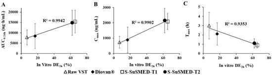 3.8. Correlations Between In Vitro DE and In Vivo Absorption