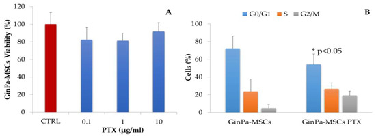 The sensitivity of GinPaMSCs to PTX, tested by a 24 h cytotoxic MTT assay at three logarithmic dosages of 0.1–1 and 10 µg/mL (Figure 1A), confirmed the significant resistance of MSCs to the toxic effect of PTX that did not affect significantly the cell viability. The cell cycle analysis, studied on GinPaMSCs treated with a standard dosage of 2 µg/mL for 24 h (Figure 1B), indicated a decreased number of cells in phase G0, accompanied by a significant (p < 0.05) increase of cells in the G2/M phase. This is compatible with the known mechanism of action of PTX, which inhibits the cell proliferation in G2/M.