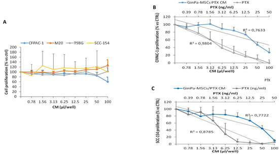 The treatment of GinPaMSCs with PTX did not significantly modify the pattern of cytokine production, except for an increase of IL8 and MIF and a decrease of SCGFb. The secretome of GinPaMSCs did not modulate the in vitro cancer cell proliferation independently of the cell line (Figure 2A). On the contrary, the secretome of cells primed with PTX (GinPaMSCs/PTX) exerted a dramatic dose–response inhibition of CFPAC-1 (pancreatic carcinoma) and SCC-154 (squamous carcinoma). Indeed, for both the cell lines, the regression analysis showed high coefficients of correlation (R2), comparable to that of PTX (Figure 2B,C).