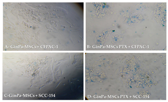 The anticancer activity against CFPAC-1 and SCC-154 was confirmed by a 24 h co-culture of MSCs and cancer cells (Figure 3). Cancer cells co-cultured with GinPaMSCs did not show any sign of toxicity (Figure 3A,C), whereas many dead cancer cells were detected in the presence of GinPaMSCs/PTX, as confirmed by intracellular trypan blue uptake (Figure 3B,D).