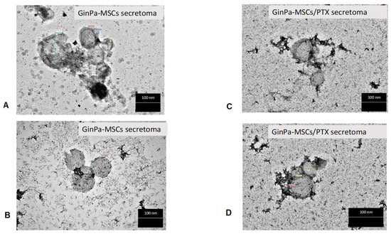 TEM analysis of the GinPaMSCs secretome suggested the presence of EVs and exosomes with different sizes ranging from 50 to 500 nm. The treatment of GinPaMSCs with PTX did not modify the morphology of the EVs/exosome presence in either of the conditioned media (Figure 4).