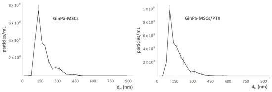 Size distribution analysis of the secretomes of GinPaMSCs and GinPaMSCs/PTX, analyzed by nanoparticle tracking assay (NTA). In both samples, several populations of vesicles were present at 200−300 nm.