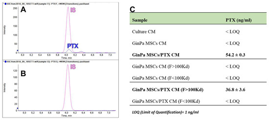 PTX dosage by mass spectrometry in EV fractions. The chromatogram identification of PTX peaks by LC–MS/MS retention time: (A) F > 100 kDa fraction and (B) F < 100 kDa fraction, in which no PTX peaks were appreciable. PTX was quantified successfully in both the unfractioned secretome and the F > 100 kDa fraction of PTX-treated GinPaMSCs (C).
