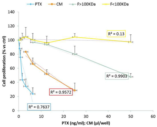 The anticancer activity of EVs secreted by GinPaMSCs/PTX was tested against squamous cancer cells (SCC154) (Figure 7). The activity is expressed as percentage of cell growth, normalized on the effect of EVs secreted by untreated GinPaMSCs used as controls. The fraction F < 100 kDa did not exert any activity against the cancer cell proliferation, with a non-significant coefficient of correlation (R2 = 0.13). The fraction F > 100 KDa produced a significant dose-dependent inhibition of cancer cell growth, also confirmed by regression analysis (R2 = 0.99), that is similar to the inhibition produced by the unfractioned secretome (CM) (R2 = 0.95). These results agree with the mass spectrometry analysis that demonstrated the presence of PTX in both CM and in the F > 100 kDa (Figure 6).