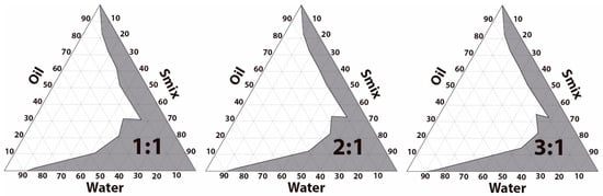 Pseudo-ternary phase diagrams using Capryol 90 as oil phase, Labrasol as surfactant, Transcutol-P as cosurfactant, and water as hydrophilic phase. Labrasol and Transcutol-P were analyzed at different ratios (1:1, 2:1 and 3:1, w/w).