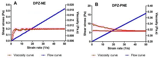 Figure 4A,B represents the flow curves τ = f(𝛾̇) and the viscosity curves η = f(𝛾̇) obtained from the rheological characterization of DPZ-NE and DPZ-PNE at 24 h after preparation at 25 °C. The flow curve represented by the relationship between shear stress and shear rate was linear in both formulations.
