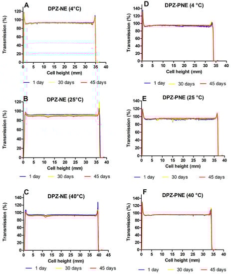 Figure 5 shows the transmission profiles (%) obtained for DPZ-NE and DPZ-PNE at 4, 25, and 40 °C over a span of 45 days. Peaks on the left and right side of the curve are the result of the meniscus formed by contact between the formulation and the glass. Both DPZ-NE and DPZ-PNE exhibited physical stability without signs of precipitation or changes in the system over 45 days under the conditions studied.