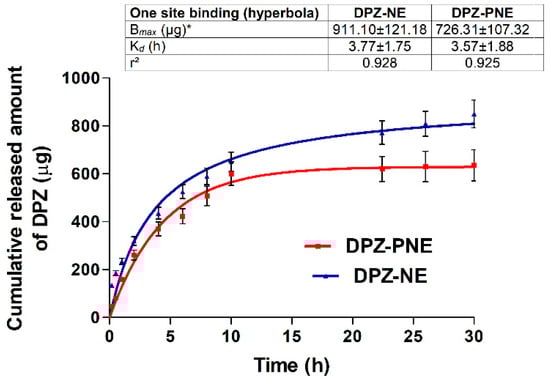 Figure 6 shows the amount of DPZ released from formulations over time. After 30 h of assay, amounts of 850 and 635.5 µg of DPZ were released from the NE and PNE, respectively. The mathematical equation that best fit experimental data based on the highest coefficient of determination (r2) was the hyperbolic model for both formulations with r2 = 0.9283 for DPZ-NE and r2 = 0.9253 for DPZ-PNE. p < 0.05 between Bmax (the maximum concentration of drug released) of DPZ-NE (911.1 µg) with respect to Bmax of DPZ-PNE (726.3 µg) was observed. The release constant (Kd) was found to be 3.77 h for DPZ-NE and 3.57 h for DPZ-PNE without significant statistical differences between both formulations.