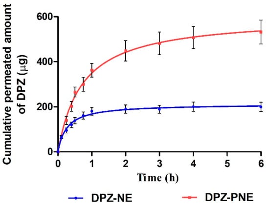 Ex vivo permeation profile of both formulations (Figure 7) shows that the amount of drug permeated through nasal mucosa after 6 h of assay was higher for DPZ-PNE (532.30 µg) compared to DPZ-NE (199.56 µg).